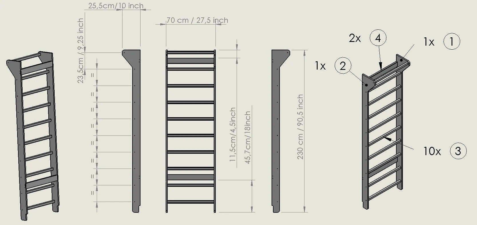- 10 Sprossen (Modell 230 cm) oder 8 Sprossen (Modell 200 cm)